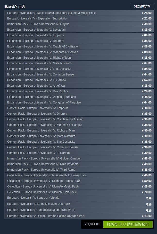 典型代表就是DLC狂魔——P社,旗下的《钢铁雄心》《欧陆风云》《群星》《天际线》等策略游戏,单个DLC可能比本体还贵,三四十个DLC的组合包价格轻松破千,并且常年不!打!折!