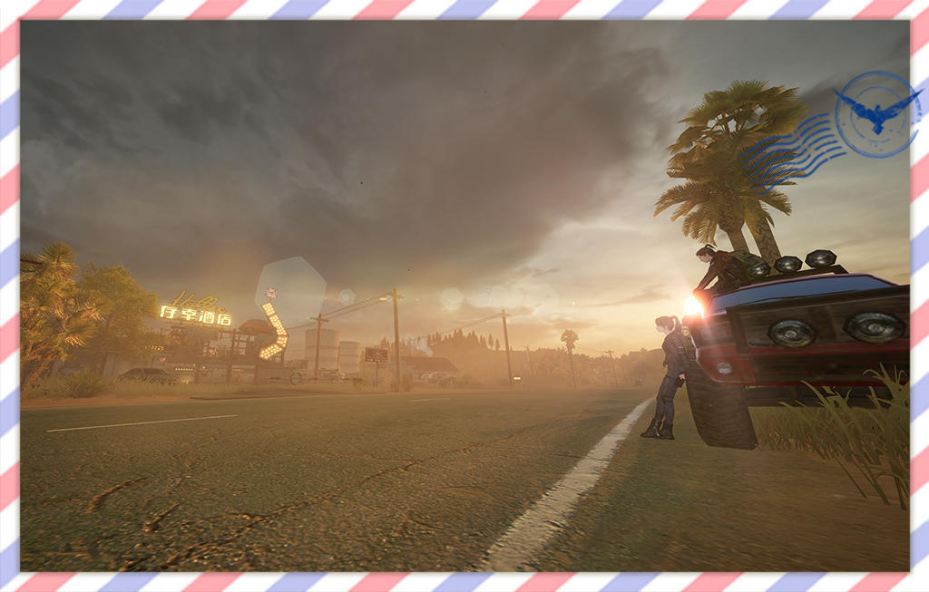 黑夜即将来临,坐落在路边的酒店招牌散发出暖黄的光芒,这是旅者们暂时休憩的地方。