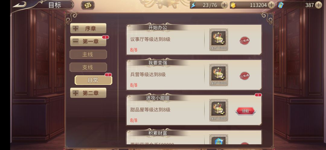 把议事厅升8级,目标里的兵营8级跟甜品屋8级的奖励也可以领了