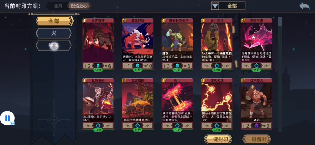 封印:非初始生物可保留眼魔、冒失的新生、烈焰马和火法师,魔法卡仅保留哥布林进军,初始封印魔法卡加大拿深渊之火概率,火系自残生物比较多无需额外封印。