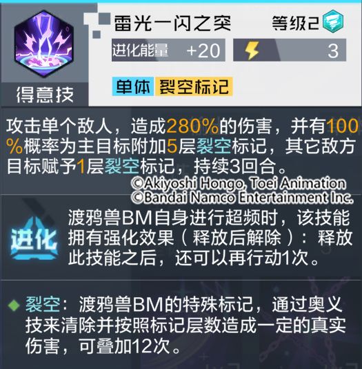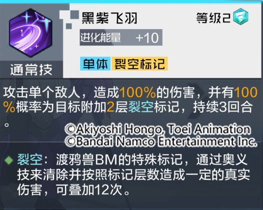 通过技能解析可以看出,渡鸦兽BM拥有极为出众的技能效果,通常技与得意技可以在战斗中,为敌方目标叠加裂空标记,奥义技则是能够根据目标的裂空标记层数,造成额外的真实伤害与技能伤害。被动技可提升自己闪避属性,成功闪避后还能触发技能特殊效果,使敌方全体附加相应层数的裂空标记。可以说是非常强大的输出类型数码宝贝,相信渡鸦兽BM在队长的阵容编队里会有不错的表现!