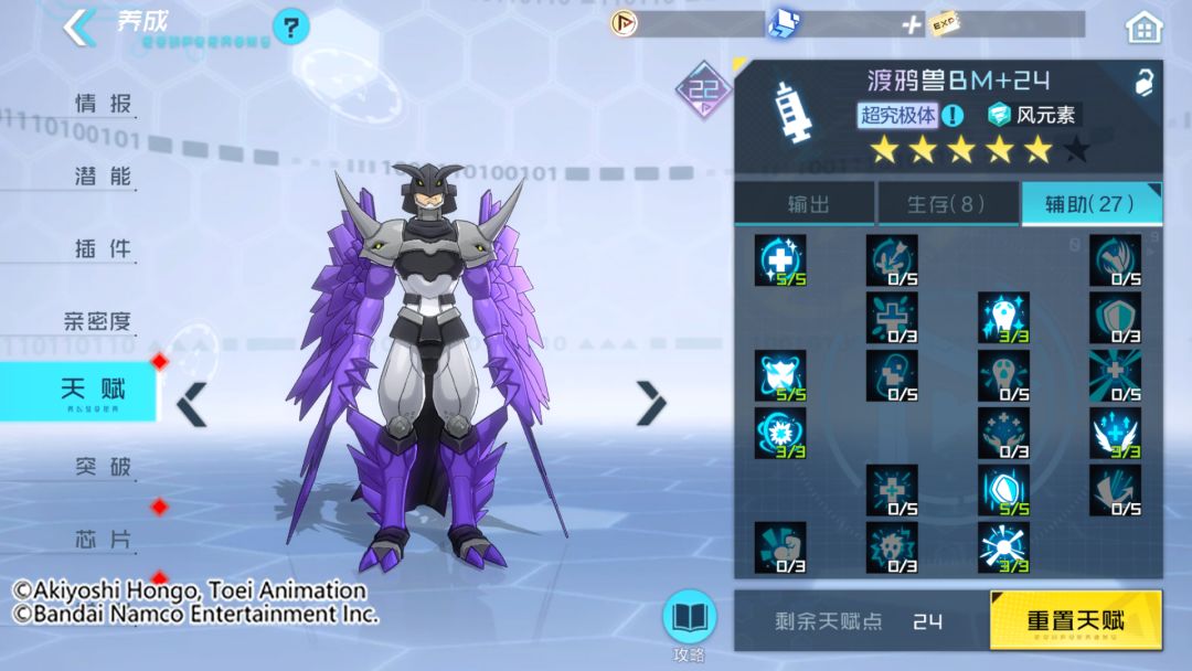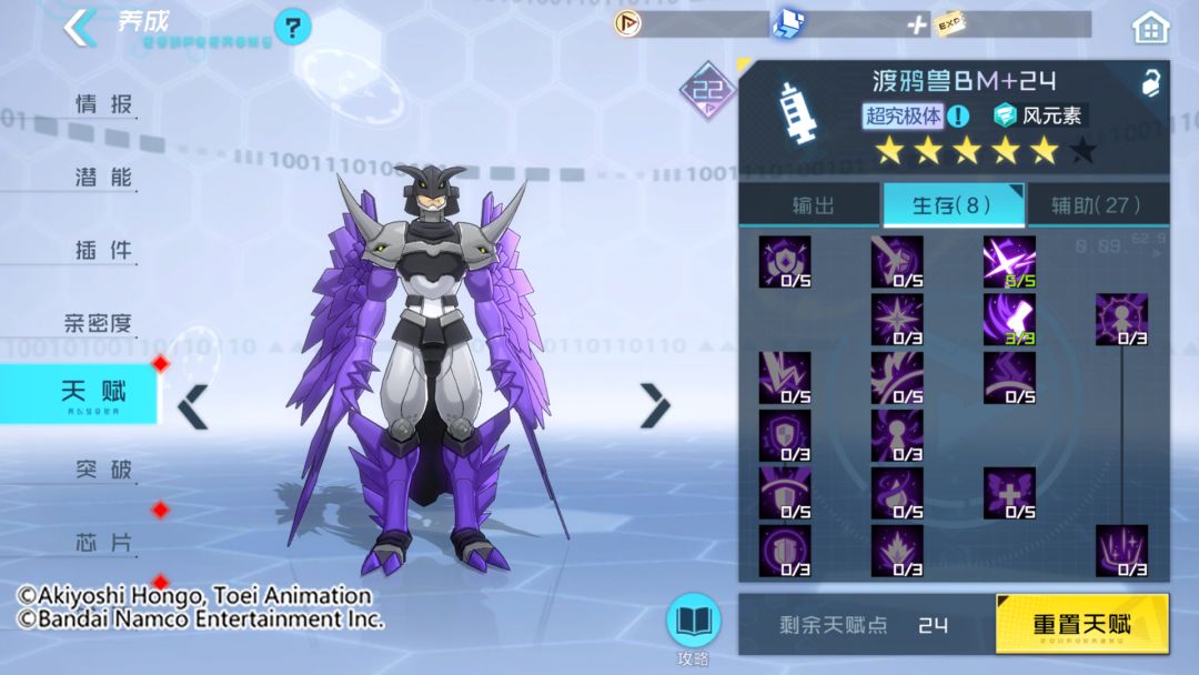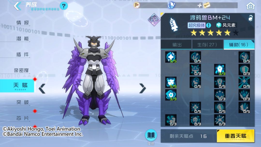 渡鸦兽BM是主要依靠裂空标记的真实伤害进行输出的数码宝贝,不需要堆叠额外的输出能力,在天赋选择上主要以提升自身技能施放频率和自身的生存为主。