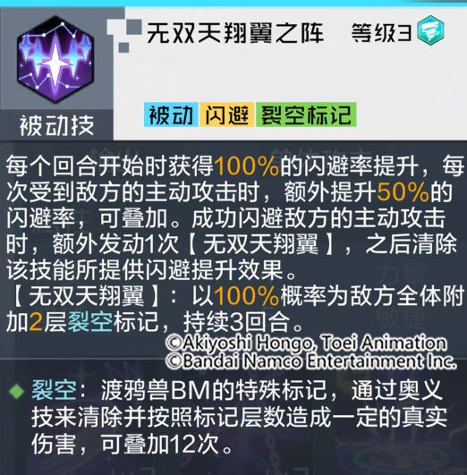 技能解析:每回合开始时为自身提供了大量闪避率,并且每次受到主动攻击都会进一步提升闪避率,成功闪避时会清除闪避提升的效果(受击可重新累积),并发动无双天翔翼对敌方全体赋予裂空标记。