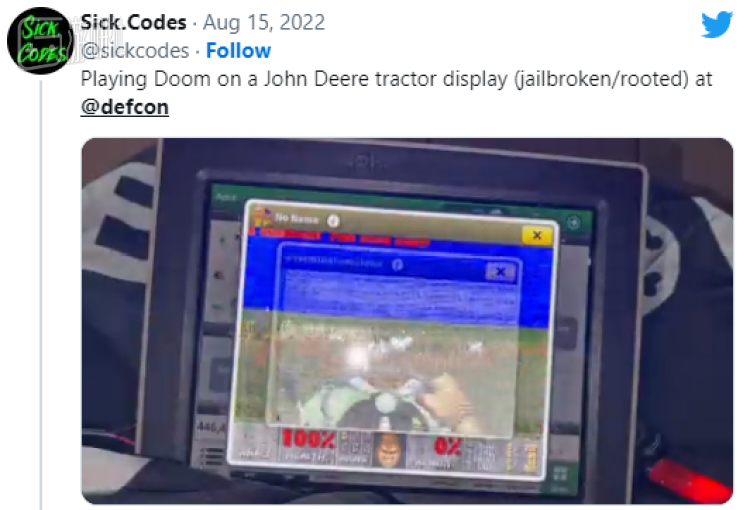 但最近,一位名叫“Sickcodes”的黑客在拉斯维加斯举行的DEF CON信息安全会议上,成功证明了迪尔公司的软件系统存在安全漏洞——在演讲台上,他向观众展示了自己是如何root该公司的操作系统,并成功在一台拖拉机的屏幕上玩起了《DOOM》。