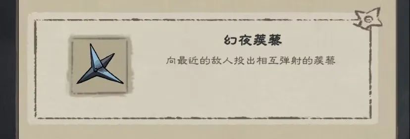 幻夜蒺藜--向最近的敌人投掷可相互弹射的蒺藜,伤害较低且无穿透能力。只可进化为魔器,进化魔器后每次蒺藜在敌人身上弹射时会引发爆炸。因为伤害太过低微且作用较小故而列为T5。