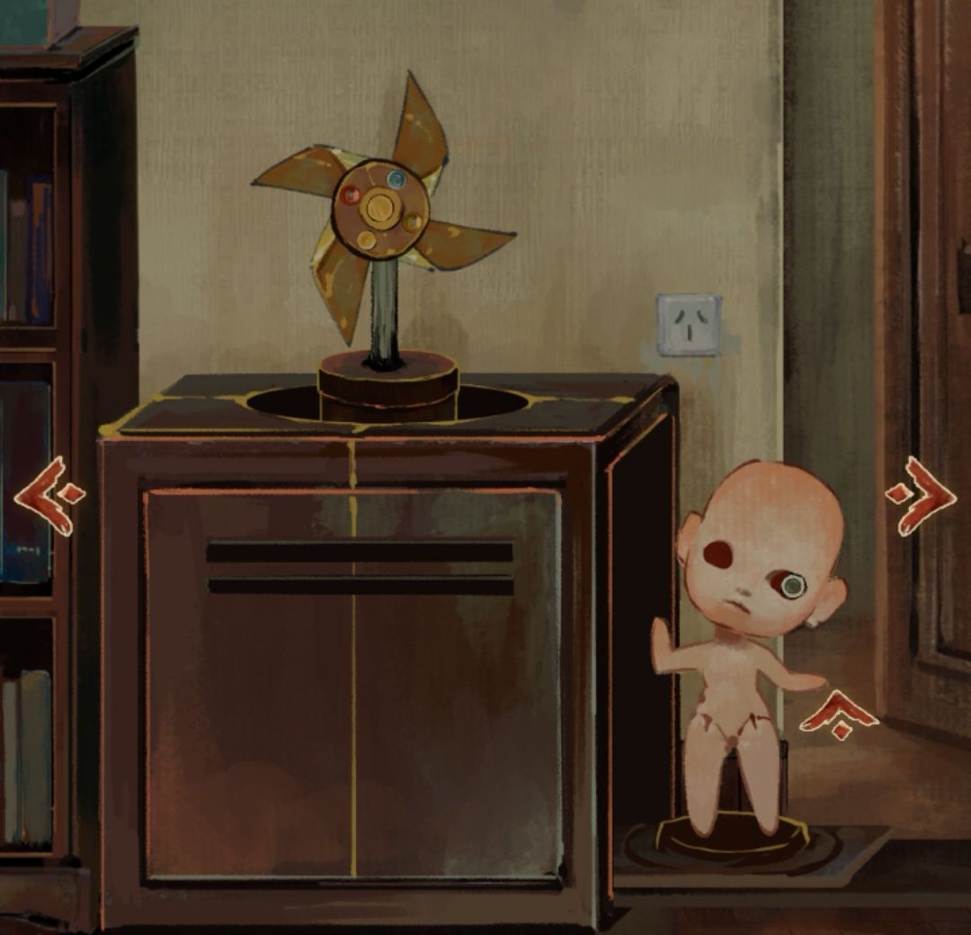 将神兽的翅膀放入屋中另一个神兽身上,神兽下落上升一个风车,将获取的四个球形装置和一个奇怪的装置放入风车中,出现一个娃娃点击他的眼睛,收集一个奇怪的装置