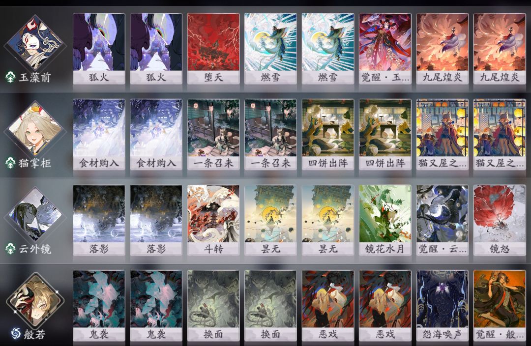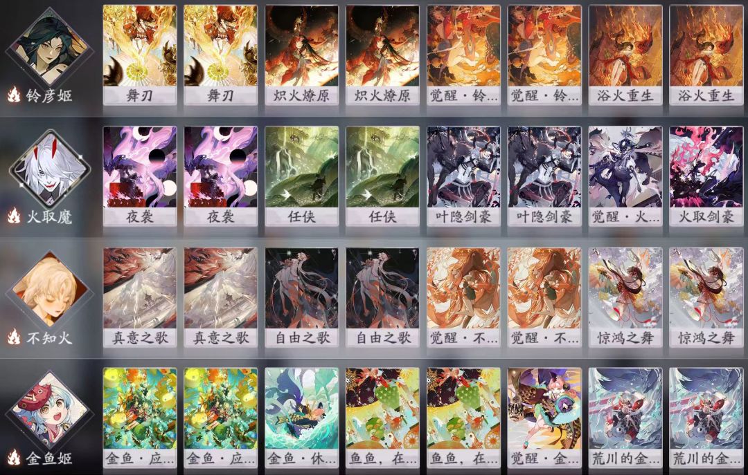 铃彦姬、不知火带卡固定,没可选性。主流带法是火取魔SSR换成一形态,金鱼姬不带觉醒,我的带法是为了防被针对(金鱼觉醒不推荐带)。