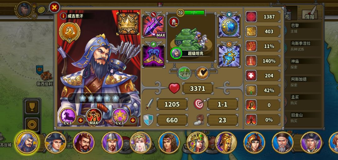 我用的萨拉丁,道中满怒满血,冲到花生面前开雷霆,运气好暴击直接收掉了,然后这回合萨拉丁就被一群李世民收掉了,可能苏莱曼或者阿育王有可能冲出去。(阿育王的面板。。。)