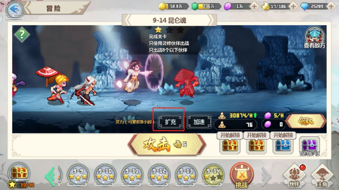 8.战斗页面的灵力一定要扩充到8小时以上 ,因为你晚上睡觉就会溢出。