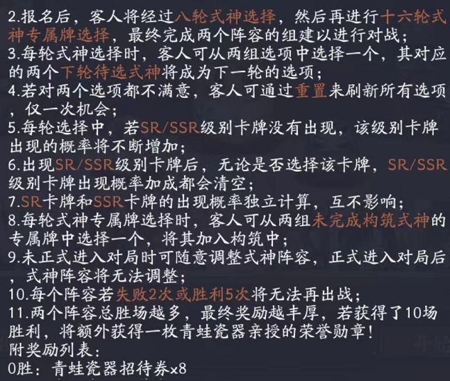 重要机制5:对局失败激励。对局失败后,可选择一个式神,会随机3张专属牌,三选一加入构筑中。——SSR概率很低,不要寄希望于此。