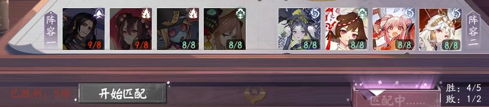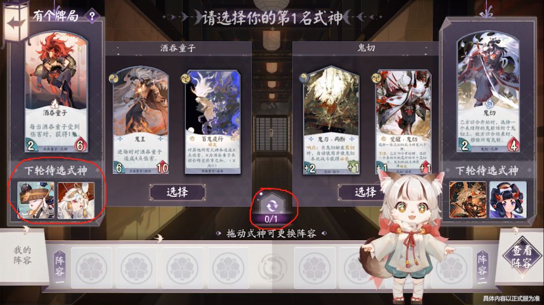 1、式神选择阶段,如上图,左右两个式神(包含其2张卡),以及下轮待选式神,选8次即8个式神,没有替补式神。