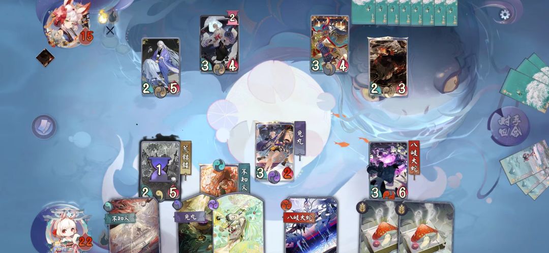 参考我在专属牌选择阶段重要机制5所作的3点解释,大天狗、奕、入殓师、玉藻前都是有两种三勾卡,加之其中三个核心都需要三勾卡作为赢点,不作赢点的情况下,只有入殓师有站场能力。底下我以八岐大蛇为核心,主抓大蛇三勾牌、神念之影,副兔丸三勾牌斩杀,其他两个人有没有SSR随缘(本局没有)。
