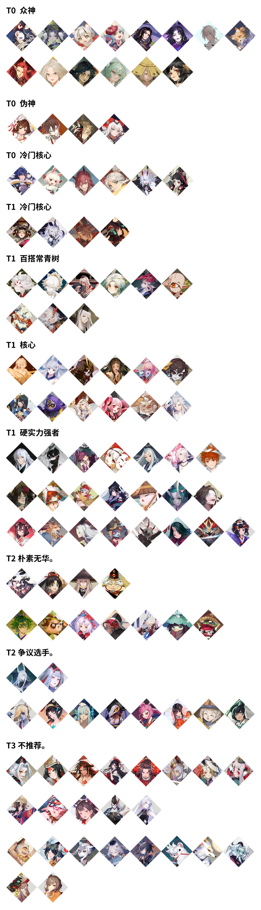 再来说榜单(T0、T1排位有强弱顺序,T2以列作梯度,T3图好记按种类分):