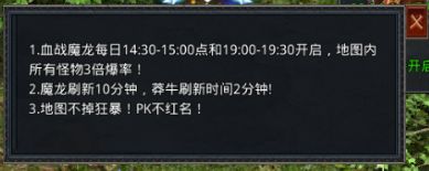活动技巧:远程职业在前期伤害合防御不够时可以卡着打,把魔龙拉到特定地形卡着打。近战则打一些莽牛和稀有魔龙,此类怪的爆率也不必魔龙差多少。
