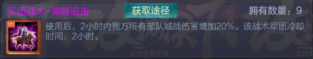 战术思路:该战术能让己方军团所占领的某座城内所有守军(含成员部队及城防军)在使用后的十分钟内伤害增加30%,强化己方防守能力,且不会随着停战而失效。