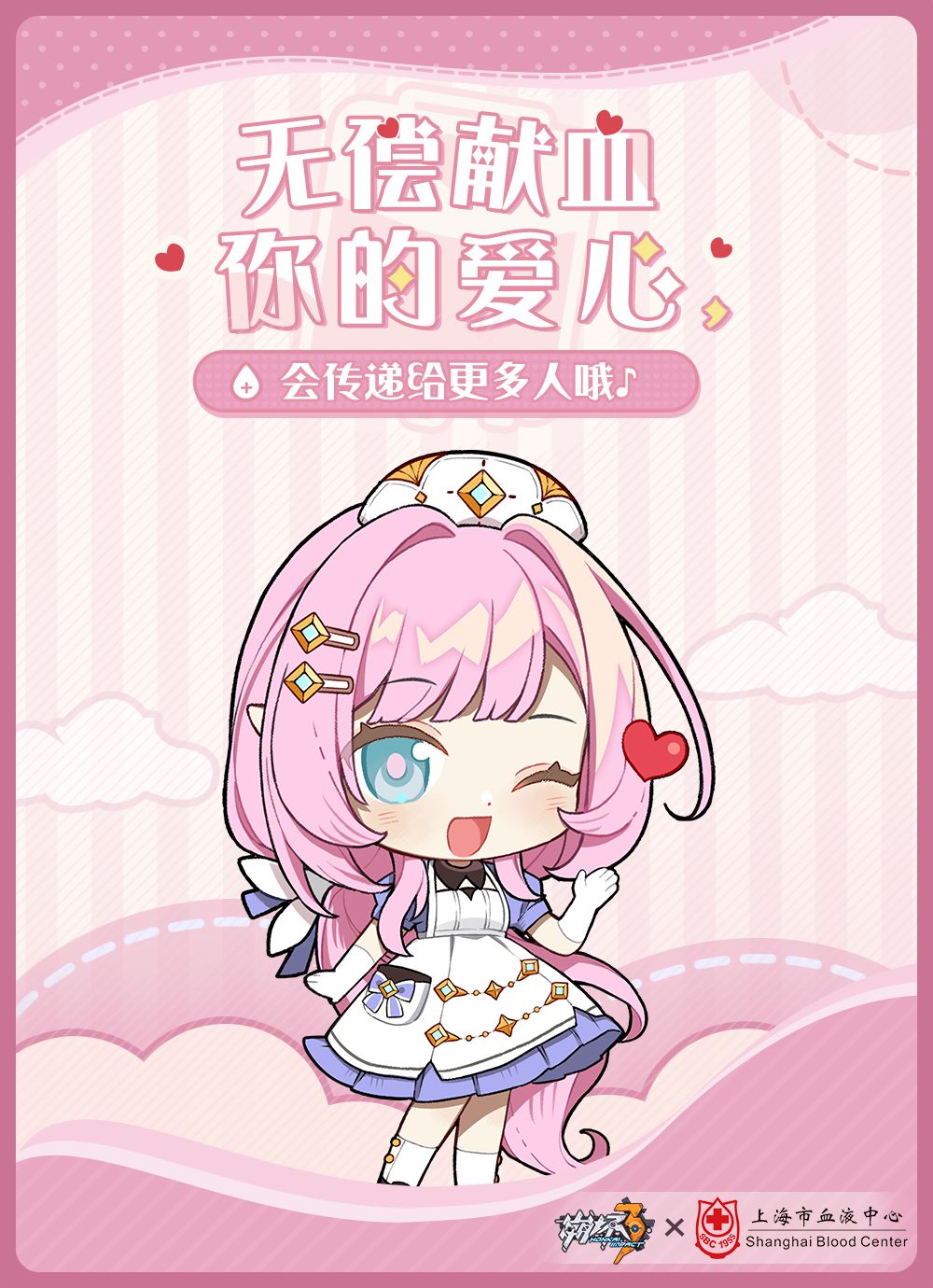 崩坏3×上海市血液中心合作进行中!活动期间,舰长前往上海市血液中心指定献血点参与无偿献血,可以在献血证上加盖爱莉希雅定制款献血公益印章,还有无偿献血“逐火”光芒主题明信片及礼品袋等周边等待舰长领取~