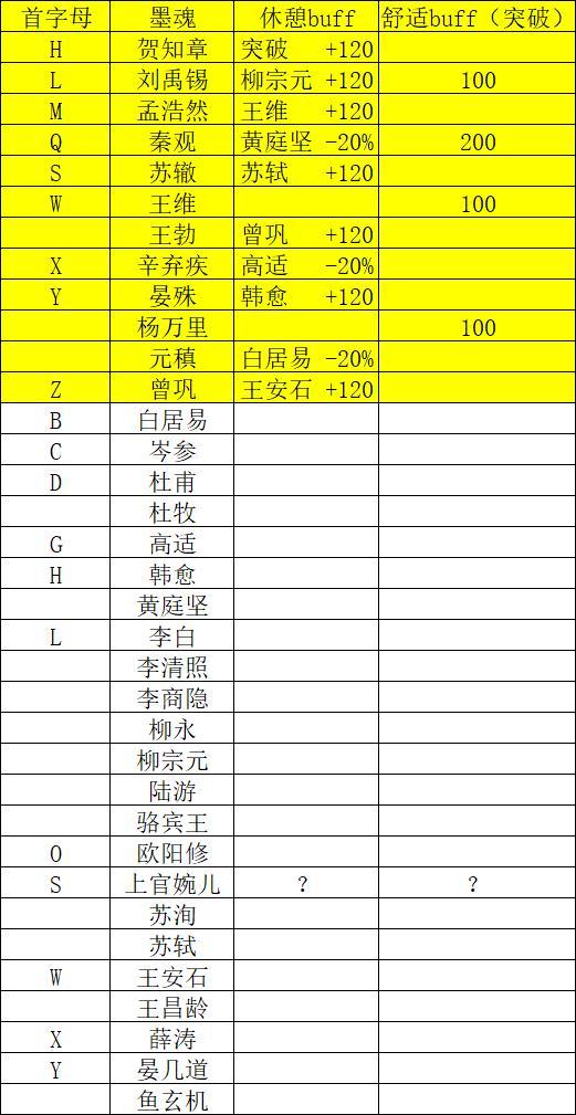 黄色部分:根据第一点的加成buff表安排入住墨魂(三苏一起没人反对吧)