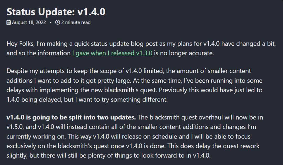 前言方面,140版本叫做“状态更新”,首先为了保证按时发布,他把原本140的计划变成了两部分,一部分就是第三关的铁匠任务更新,估计是因为内容太庞大,所以作者把它放在了150版本,另外一部分就是这次要更新的内容。
