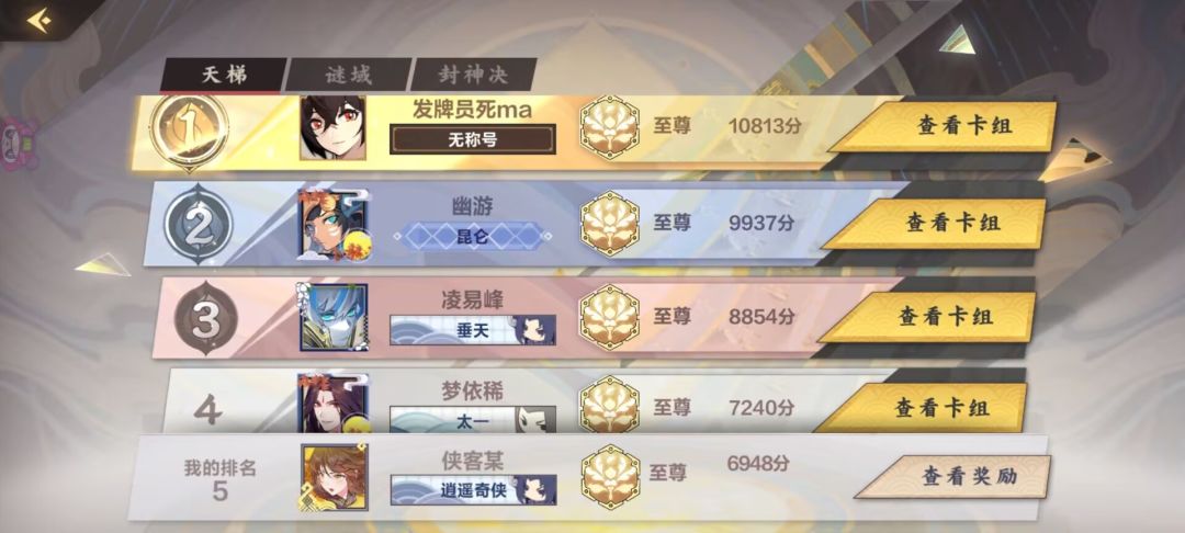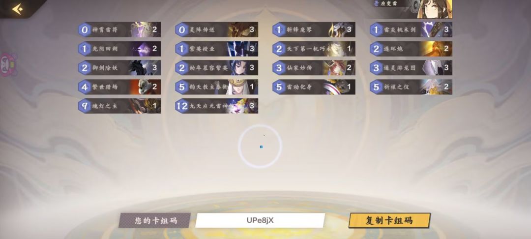 应该是两三年前逛TAP看到的卡牌+仙剑的内测服,玩的感觉蛮不错,但是后面公测就没消息了(或许是自己不够关注)。上个月底才知道正式服早就上了,光速下载,肝到今天刚满30天。游戏本身福利就不错,但是氪金点设置的很奇怪。因为内测的时候都是玩的雷,所以正式服也还是玩雷比较顺手。中间玩过一段侠客土,应该是上个月用雷上到圣一,之后就在圣一一直折磨,后面换成了侠客土,才突破瓶颈上的至尊。然后这个月卡牌多了之后,才构筑了现在常用的这个雷卡组。没想到手气顺上到了比较靠前的排名(也可能是因为游戏日活不太足)。这个帖子就当是记录一下自己这时的卡组和想法分享。