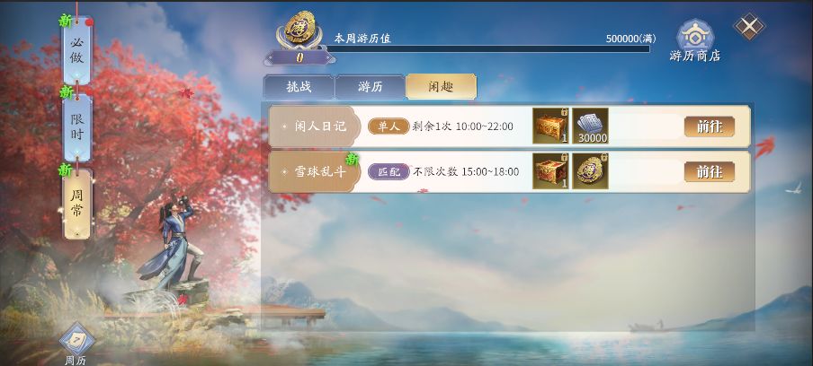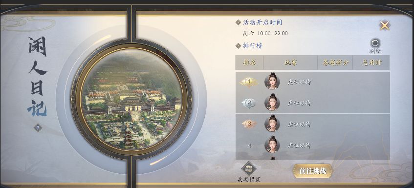 闲人日记为单人休闲竞技活动,活动的开启时间为每周六早上10点到晚上22点,少侠可以通过活动界面的闲趣页签进入活动,与来自五湖四海的奇人异士们一决高下。