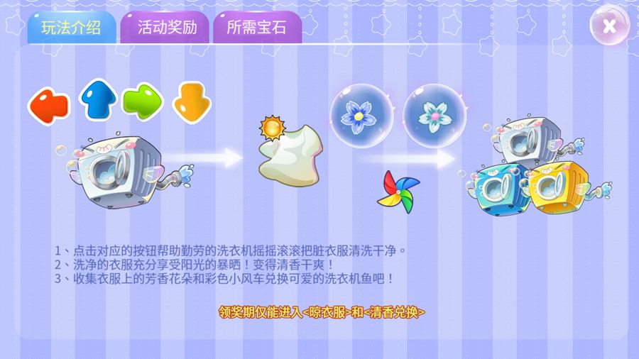 1、本活动分为三部分:清爽洗衣、晾衣服、清香兑换;