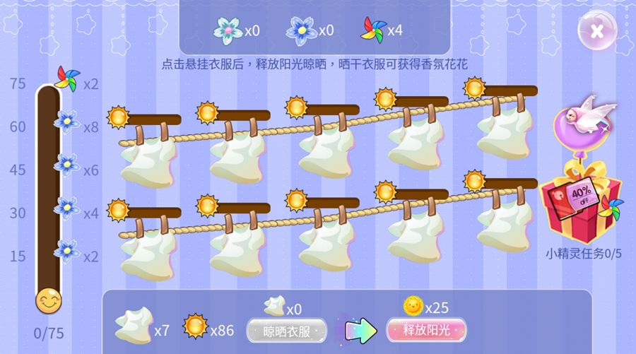完成后开始收集阳光啦~点击洗衣机上方的气泡,完成任务收集小红花来积累左侧进度~