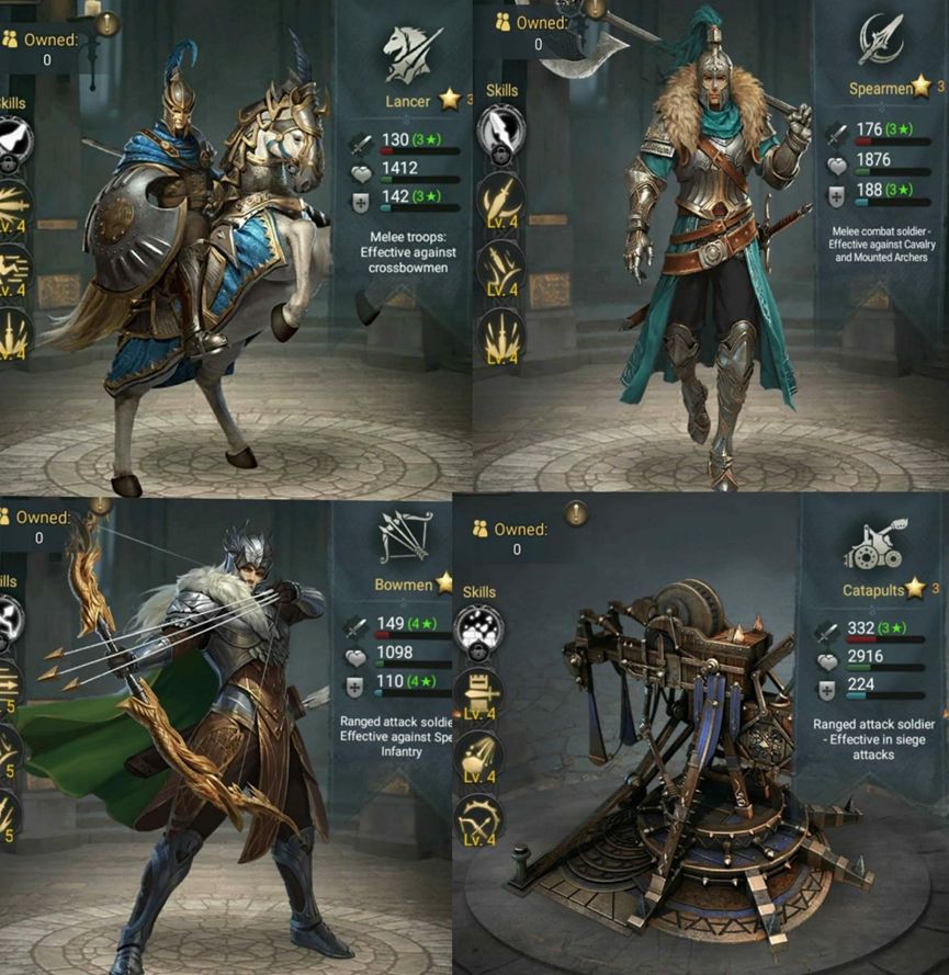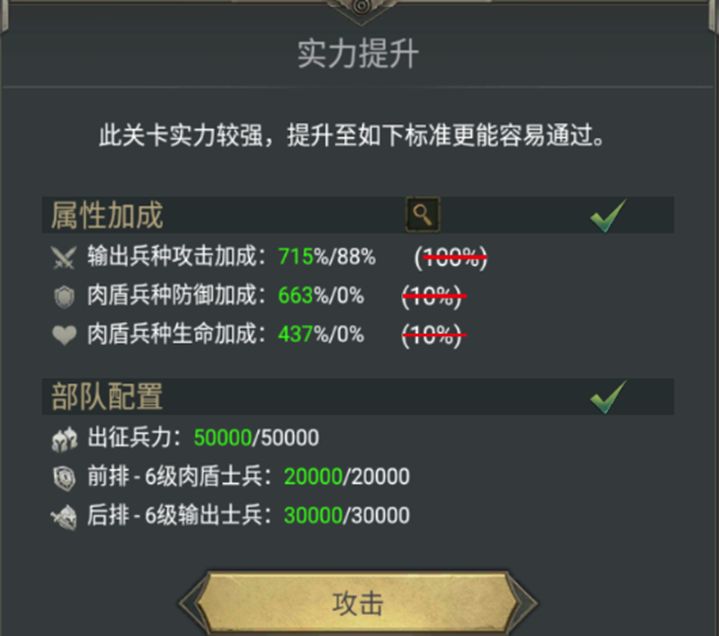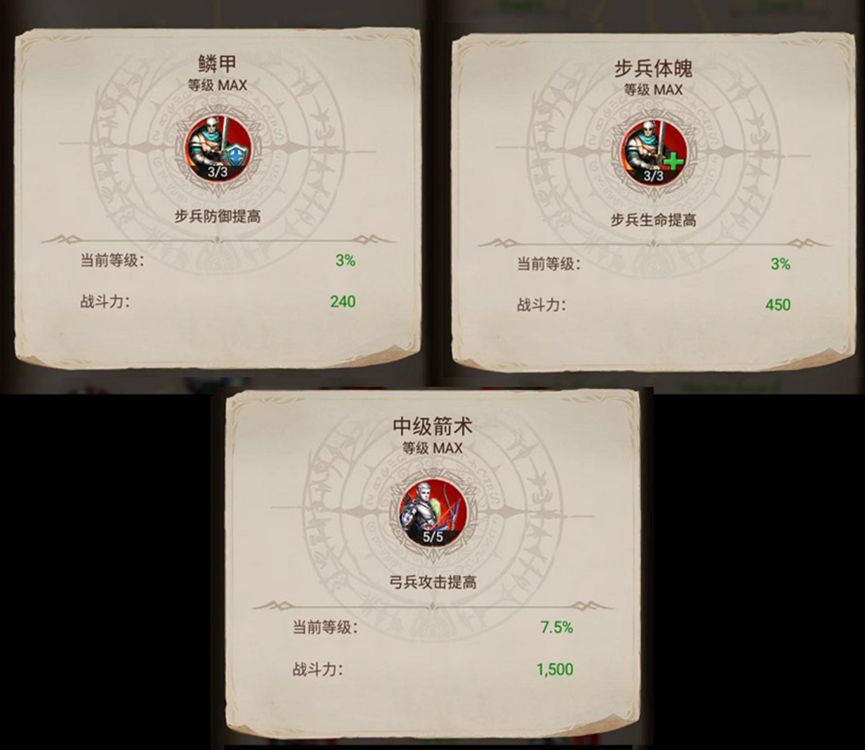 ①英雄等级:记住要时刻关注战斗英雄,这会增加你所玩英雄类型的属性加成。你可以在英雄界面的“英雄搭配”中找到正确的英雄组合。另外,请记住为这些英雄使用正确的技能书。例如,我喜欢让我的弓兵英雄学习弓兵攻击、步兵生命和步兵防御这三种技能。