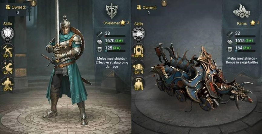 肉盾部队是你的阵型(盾兵和冲车)的伤害吸收者。增加这些部队的生命值和防御值很重要。即使您正在玩弓兵或骑兵,您也需要在前排配置盾兵来保护您的后排。