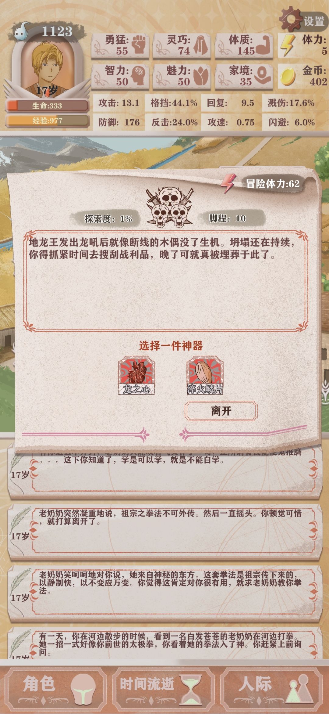 当盾勇百分百格挡,百分55反击是什么体验?你打我等于你打你自己?今天教大家一个拿五个隐藏神器的攻略;首先这个对体力的要求较高,因为这是在前期体力拿属性资源不浪费的条件下;首先,前期体力不要乱用,要保证你去开荒的时候有五十点体力,再有商店里的东西除了鱼钩可买可不买以外其他的都要买,这些都是你能打到隐藏boss的关键,boss掉落的神器很有用属性什么的后面说,五个boss可以拿五个神器,直接起飞。因为我打的时候忘记截图精灵图的神器了所以在这里没有神器的图不好意思。不多说,进图开荒在有盾勇的条件下在营地你要选休息,这样才能让你支撑到隐藏bos……