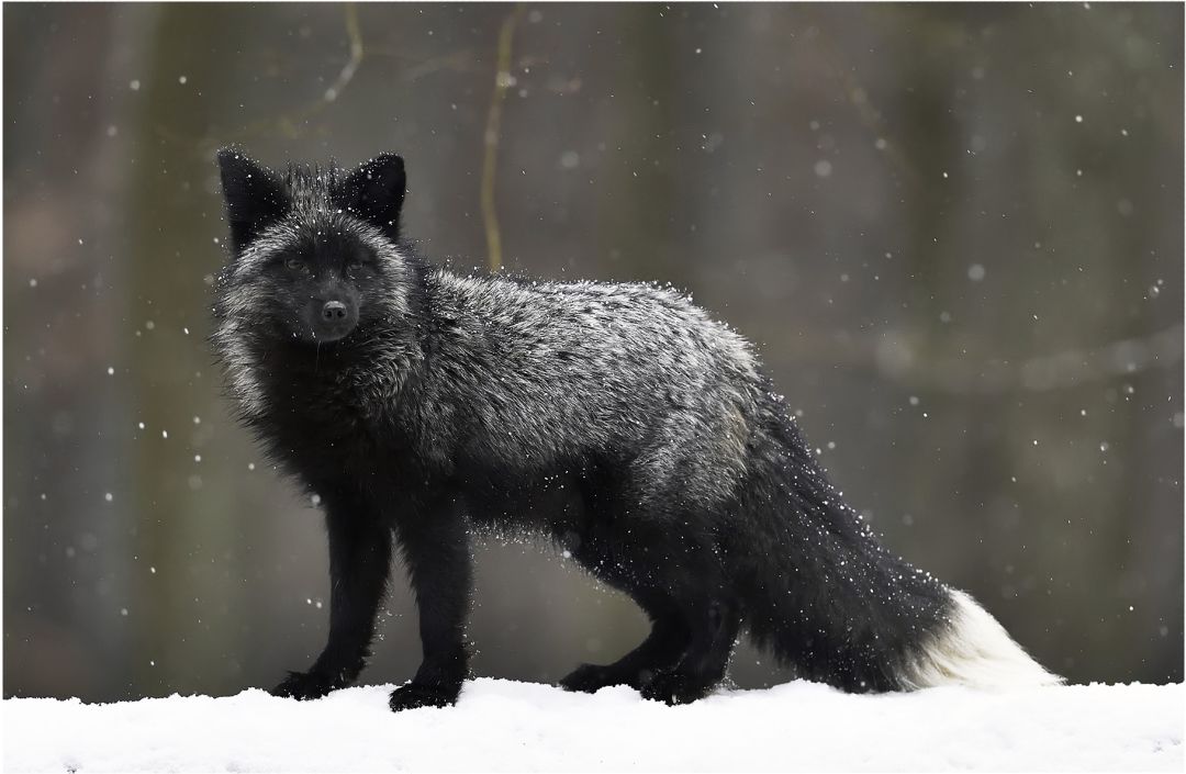 银狐是北狐的毛色黑化变种,特征为灰色的体毛,黑色的双耳有一些白毛混杂,呈现出一种迷人的烟熏银色 !