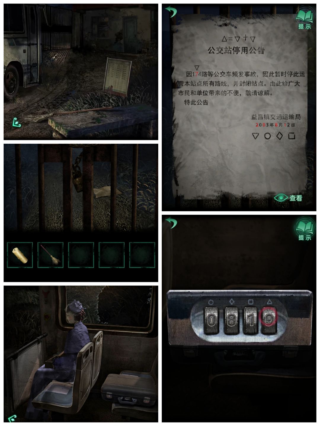 点击大铁门,剧情过后,点击门外的纸,提示“太远了摸不到”,对纸使用扫把,拿到〔公交站停用公告〕。