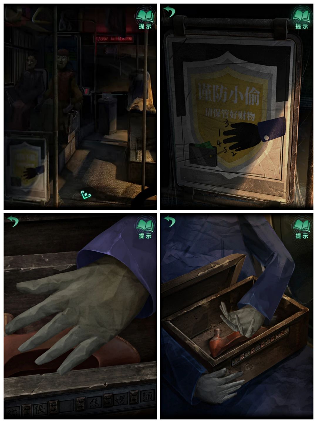 3.转到两个乘客的场景,点击观察谨防小偷的公告牌,得出手指顺序的线索,“3-大拇指,1-食指,4-中指,5-无名指,2-小拇指”。