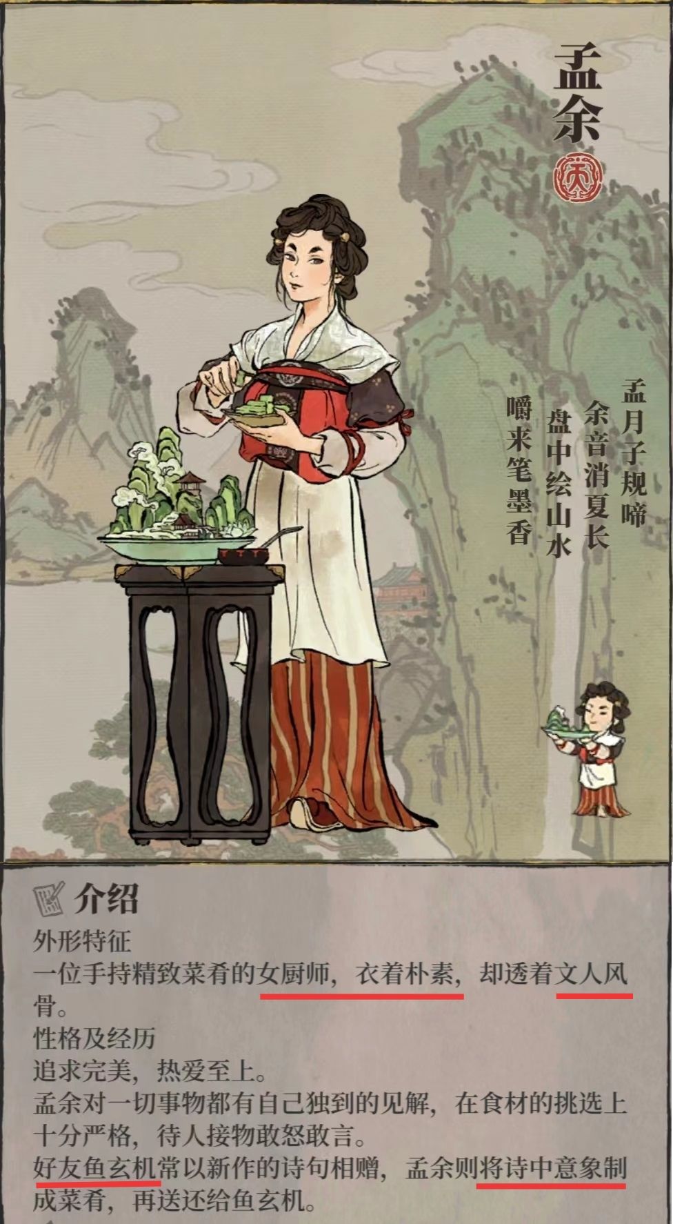 孟余的角色介绍中提到她“衣着朴素”却“透着文人风骨”,与梵正尼姑的身份和拼盘的诗意相吻合,其人物关系设定是与鱼玄机(道士)交好——或许是考虑到两位出家人惺惺相惜(其实所处年代不同)。至于立绘中的山水拼盘,尚未从王维的《辋川图》中找到原型,有个小发现是与仇英的《辋川十景图》和《青绿山水图卷》的局部都有一丢丢相似(忽略不计)。