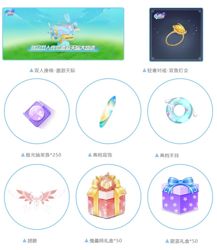 此外还可兑换高档组合装-夏语茶会、臻品双人座椅-遨游天际、轻奢对戒-双鱼灯会、背饰-夏日冲浪、手持-66游泳圈、翅膀-桃夭蝶舞、傀儡师礼盒*50、蔚蓝礼盒*50等奖励!小主人们快把它们带回家叭~