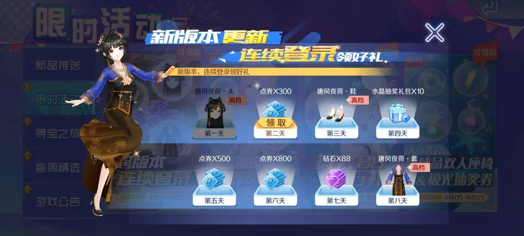 截止至9月3日,连续登录游戏共计可带走高档套装-唐风夜荷、头发-唐风夜荷、鞋子-唐风夜荷、水晶抽奖礼包*10、点券*1600、钻石*88!