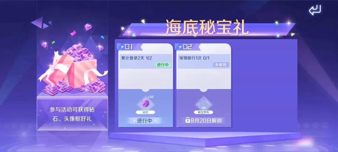 截止至8月25日,参与【海底秘宝礼】活动,完成累计登录任务可领取88钻,完成宠物旅行任务可领取头像框-秘宝梦屿!