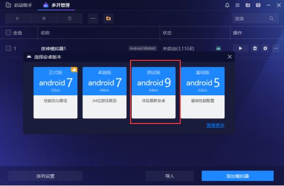 点击多开管理→添加模拟器→选择Android9 -64bit-