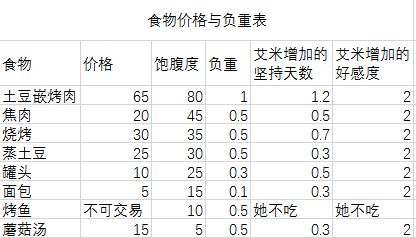 食物价格、负重和饱食度数据