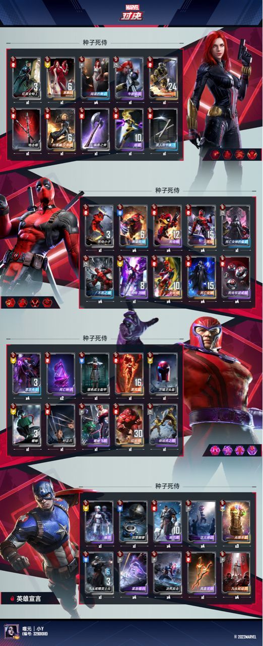 大家好,我是小Y,新赛季已经第二天了,万磁王的卡大家也一直在开发,各种搭配都反复尝试,结果就是以万磁王的卡为核心的卡组强度差强人意。三联机制的体系卡限制较大而收益却没法帮你获胜。万磁王的卡缺乏终结比赛的能力,其后期能力与上赛季主流卡组之间没法比,更有银色铠甲和剑齿虎这种意义不明的废卡。但与此相伴的,自然有一些强度比较突出的单卡可以拿出体系外作为其他卡组的外挂插件。因此我们退而求其次,本攻略将万磁王的几张优质单卡加入死侍,在前期对死侍进行补强好帮助死侍更安全得成型。采用寡妇辅助原因是,这年头有把狙后期打很多卡组就有了一战之力,而考虑到需要黄卡三联的缘故,春寡正是最好的第三张黄卡选项。所以放弃了钢铁侠的血魔经济体系(小辣椒,夫人,黑豹,已然用去三个黄卡位置)