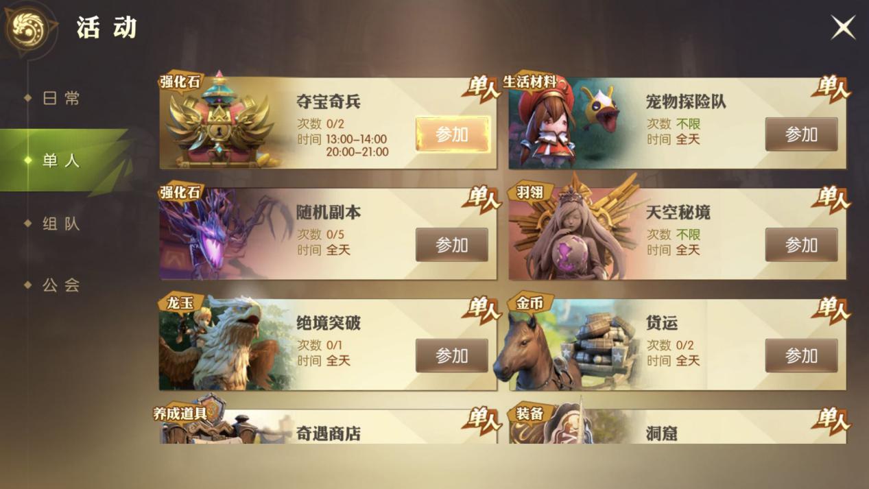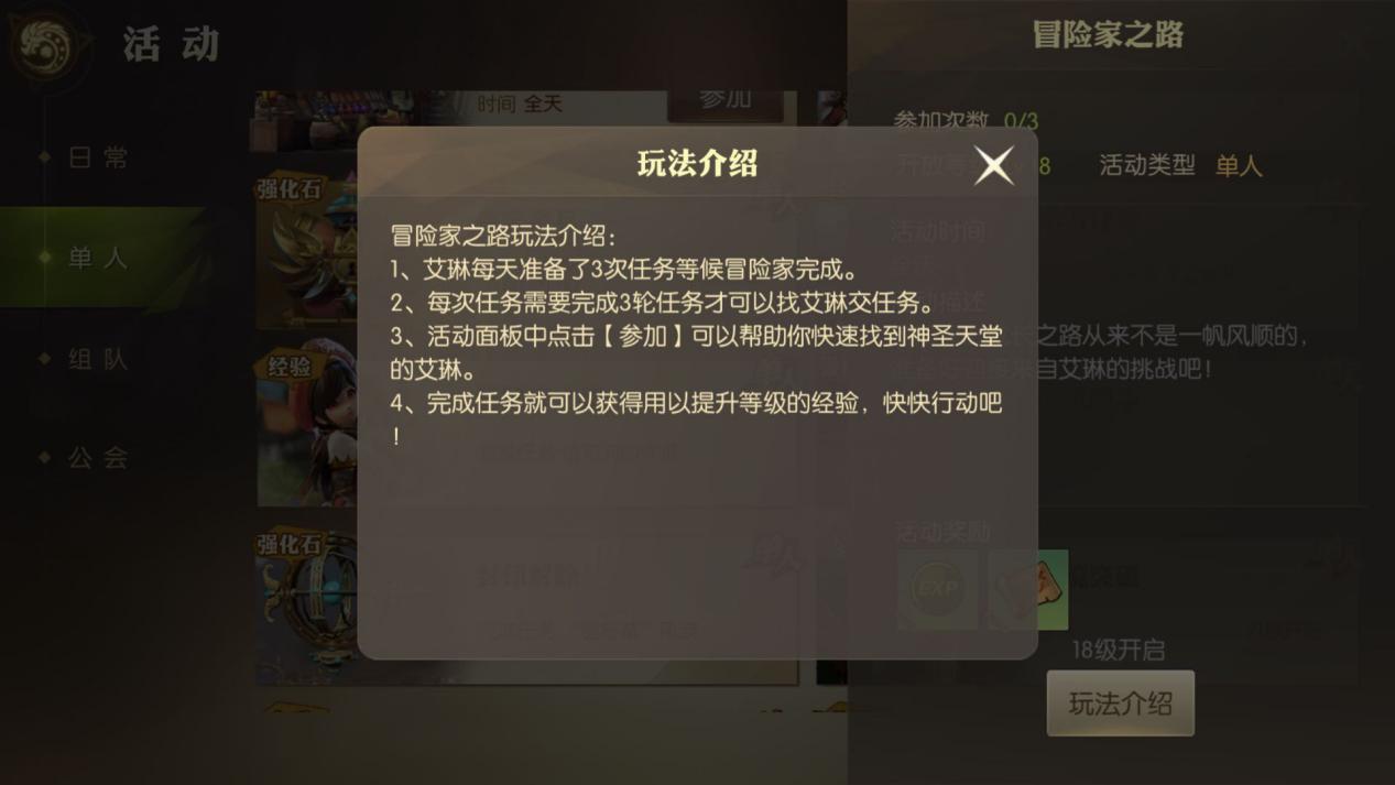 日常活动,绝对是每个游戏获取经验的重地!各位新手冒险家们可以在游戏顶部的“活动”栏目中通过玩“单人(组队)狩猎“,“学者课堂”,“冒险家之路”来获得大量的经验。