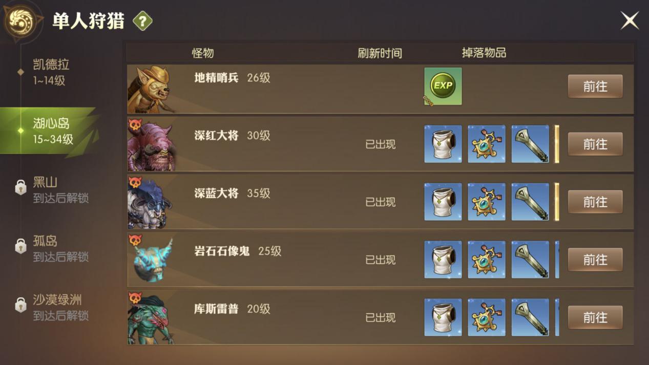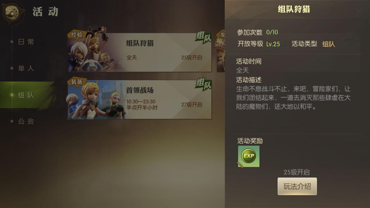 最后,活动中的狩猎也是获取经验的地方,不过经验较少,手坚建议大家无聊的时候练技能的时候可以来刷刷。值得一提是,单人狩猎不仅可以刷经验,还可以刷一些简单的装备哦~而组队狩猎要在25级以后才开放。