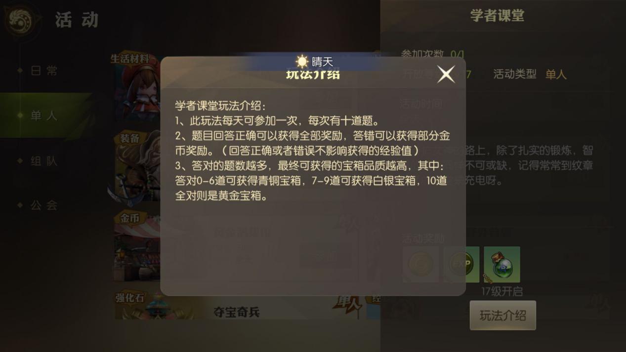 其中学者课堂比较简单,主要是答题。不管答对与否,都有经验哦,每日都可参加。