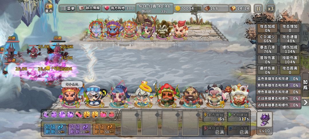 24-34波,这个阶段基本为挂机刷神技的阶段,根据所拿神技的情况卖掉小青。并顺便可以在黑市运营一下。最重要的是在金币木材600:10的时候,全部换成金币,因为后面不缺木材。下一个阶段我们要开始刷主力英雄的3技能了。
