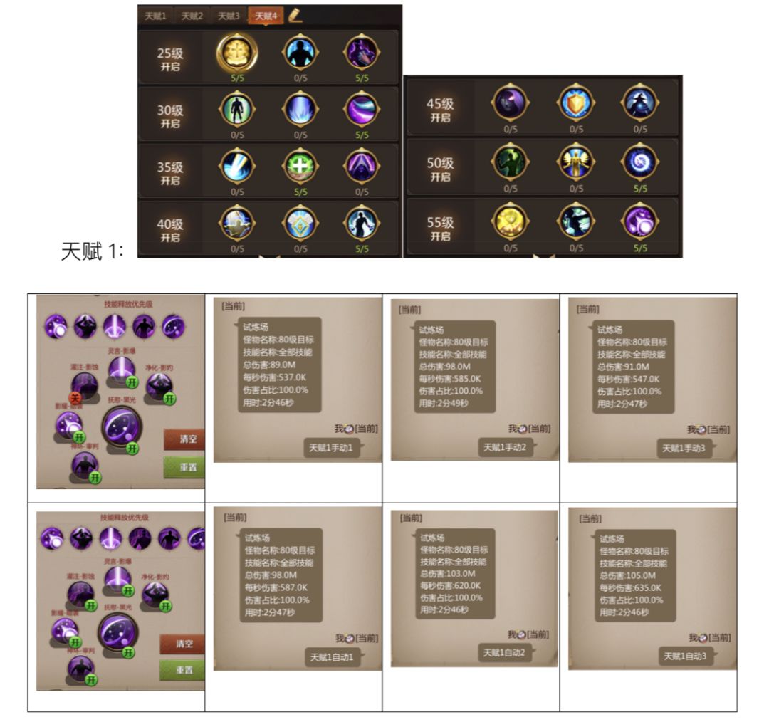 首先,我想提一下暗牧的自动战斗的设置,主宠为处决,词缀为通窍,在其他条件不变的情况下,针对天赋及自动战斗设置变化进行测试,结果如下: