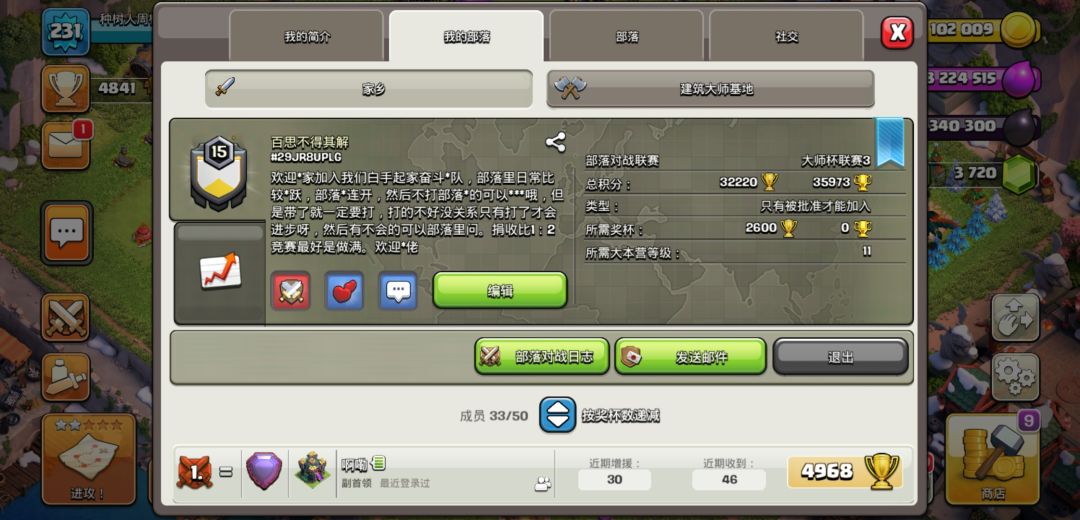 老部落了,部落里高本发育稳定,中低本也保持活跃,部落战连开,联赛有大师1的壳子稳定混联赛币,微信群日常开车聊天。
