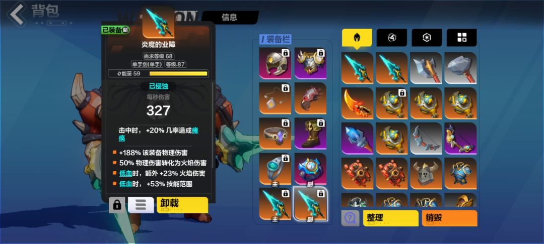 装备:核心装备是两把炎魔,一个项链,戒指勉强算,基本全身装备都可以随便换的那种,整体造价非常低廉,装备全都是自己打出来或者自己做的