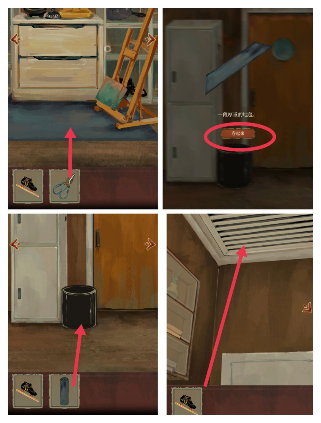 用剪刀剪下被压住的毯子,卷起来以后放进垃圾桶拿来垫脚,就可以够到天花板然后用冰刀拧开螺丝获得关于瑶山的文件