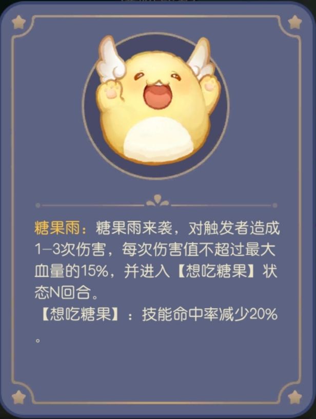 ▲特殊:水火雷→糖果雨,造成1~3次伤害,每次伤害值不超过血量上限的15%,并触发“想吃糖果”效果(命中率减少20%)。