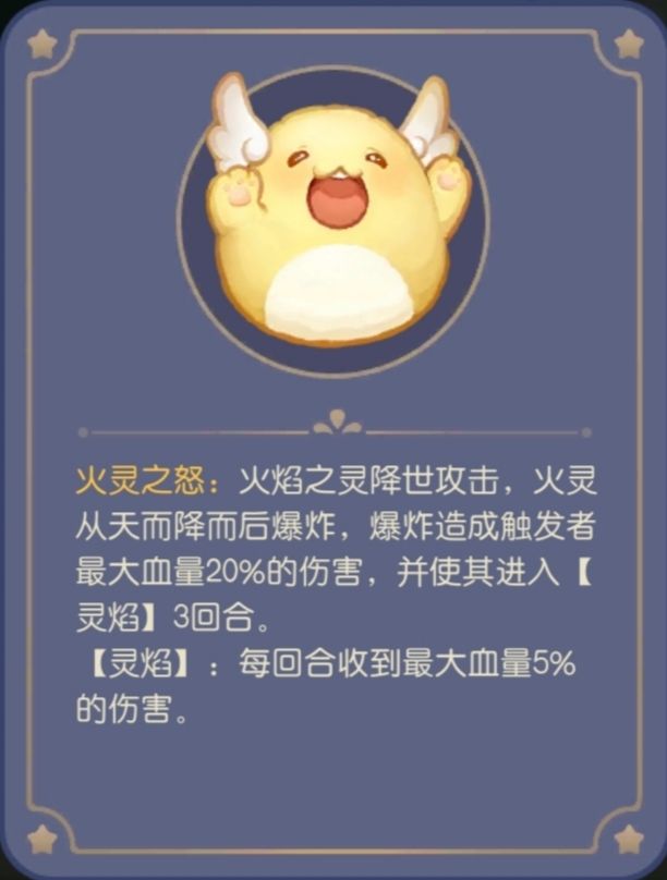 火火火 → 【火灵之怒】:当回合造成最大血量20%的伤害,后续三回合每回合受到最大血量5%的伤害。