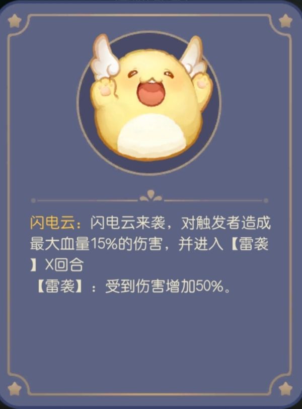 水雷雷 → 【闪电云】:造成最大血量15%的伤害并触发“雷袭”效果(受到伤害增加50%)。